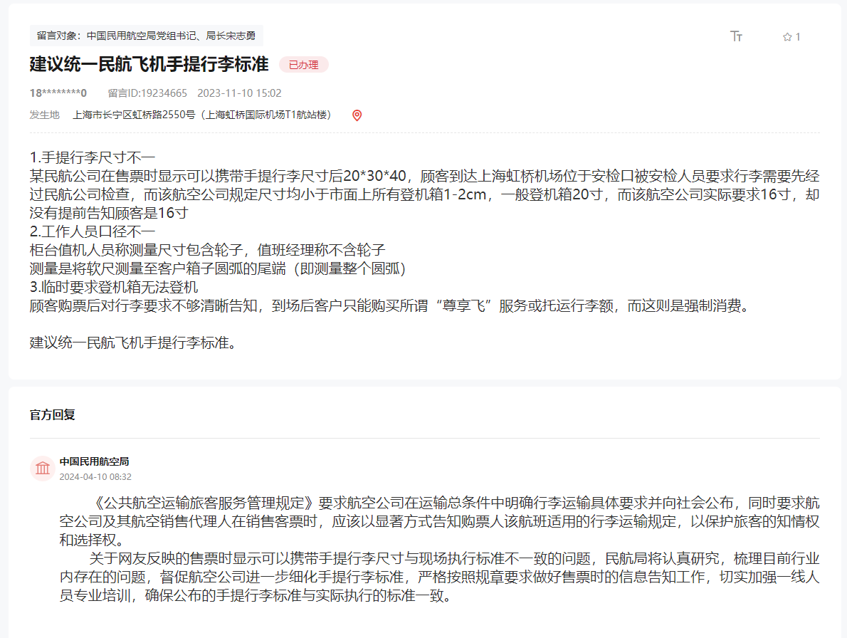 有网友通过“领导留言板”留言指出,某航司对行李箱尺寸要求不够清晰,建议统一民航飞机手提行李标准。